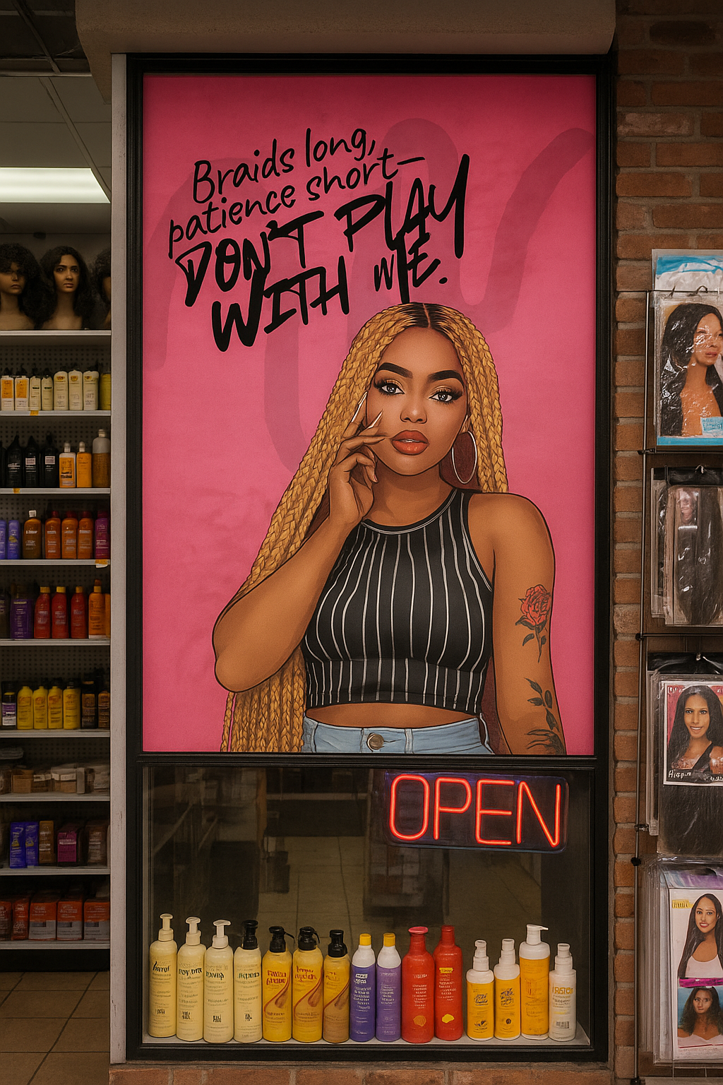 Bold braids, bold attitude. This vibrant wall art brings all the energy—long braids, glossy lips, and a look that says don’t try me. The perfect statement piece for anyone who loves beauty, confidence, and a little bit of attitude in their space.